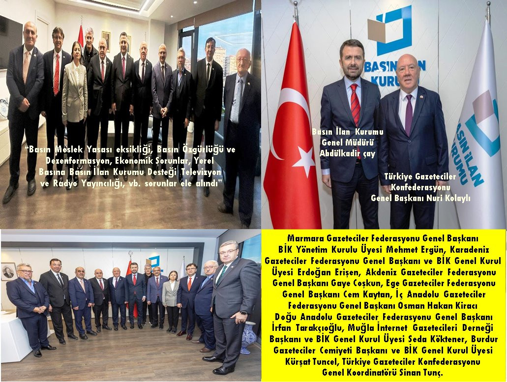 Türkiye Gazeteciler Konfederasyonu Genel Başkanı Nuri Kolaylı, TGK'ya üye Gazeteciler Federasyonlarının Genel Başkanları ve TGK'nın adayı olarak Basın İlan Kurumu Genel Kurulu'na seçilen temsilcileri, göreve yeni başlayan Basın İlan Kurumu Genel Müdürü Ab