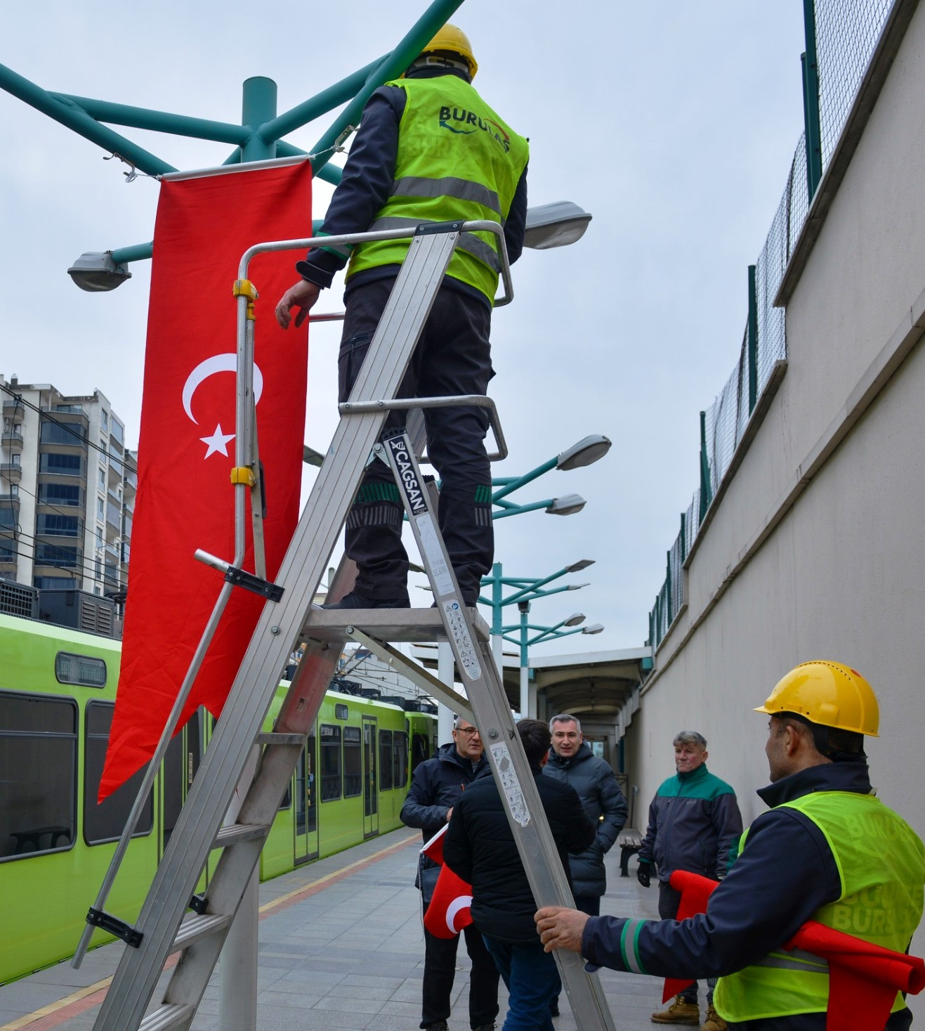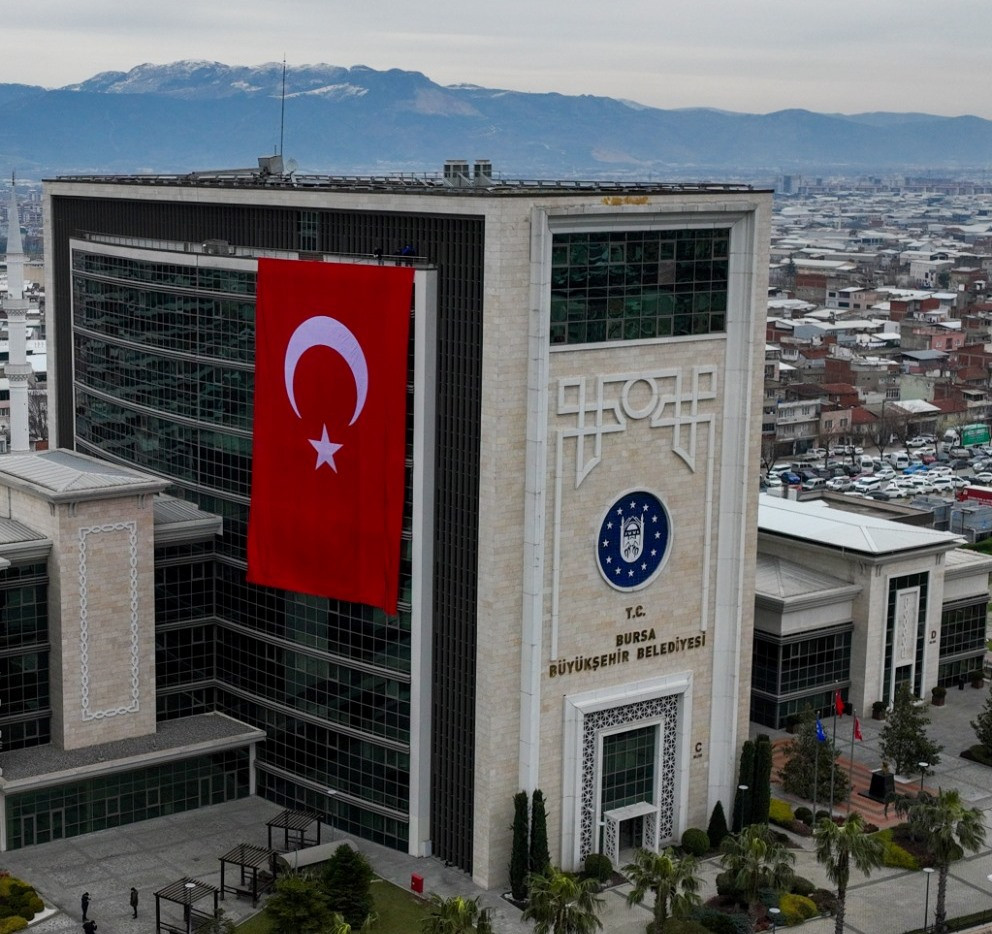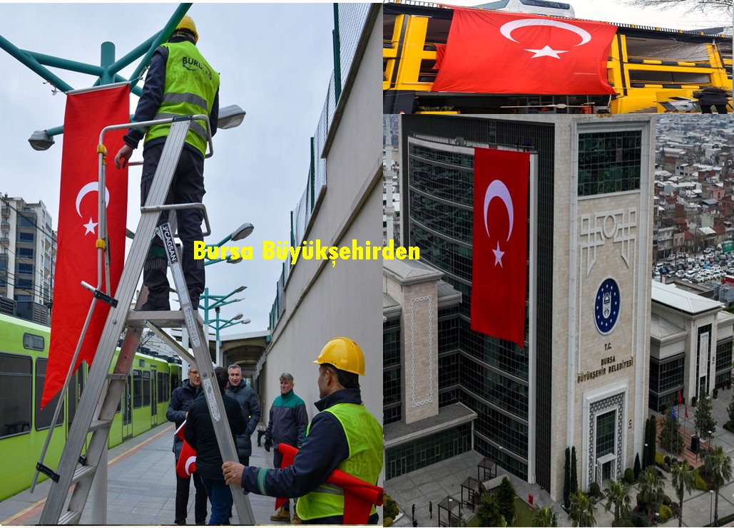 Bursa Büyükşehir Belediye Başkanı Mustafa Bozbey’in talimatıyla belediye binaları, BursaRay istasyonları, belediye otobüsleri ve otoparklar dahil olmak üzere kuruma ait tüm alanlar ay yıldızlı bayraklarla donatıldı.