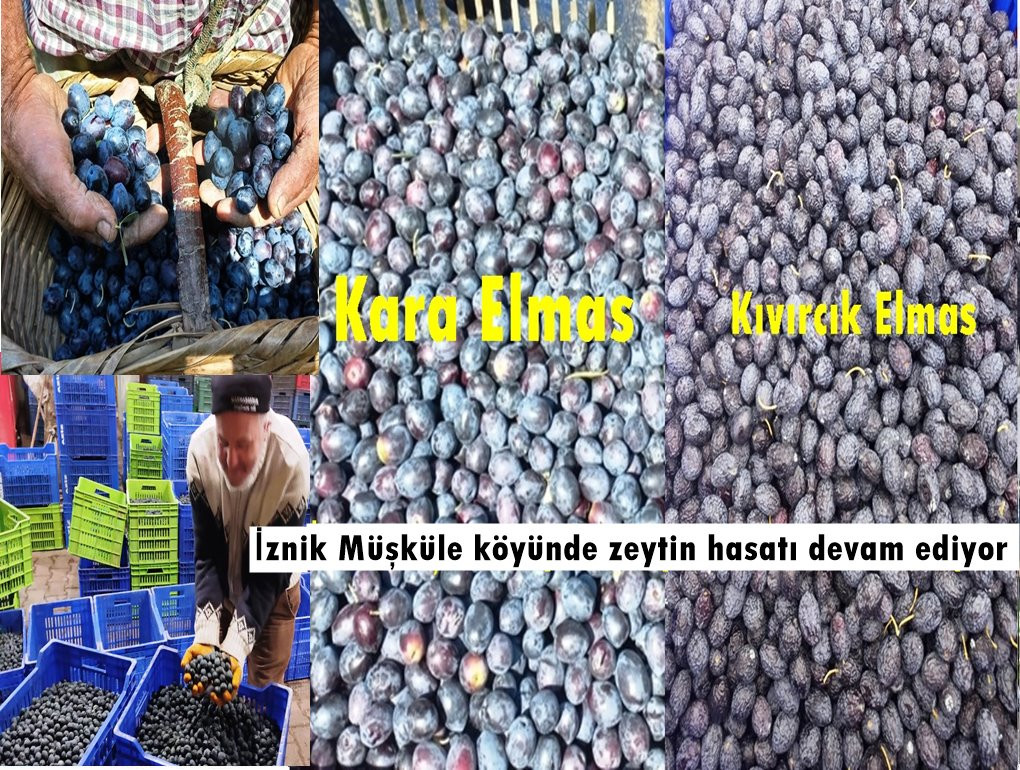 ZEYTİN TOPLAMA HASATI MÜŞKÜLE KÖYÜNDE DEVAM EDİYOR Müşküle köyünün kara elmaslarının (Zeytin) toplanması devam ederken hava şartlarının soğumasıyla zeytinlerde suyunu çekerek kıvırcık oldu. Şimdilerde Müşkülede bazı üreticiler şubat ortalarına kadar kıv
