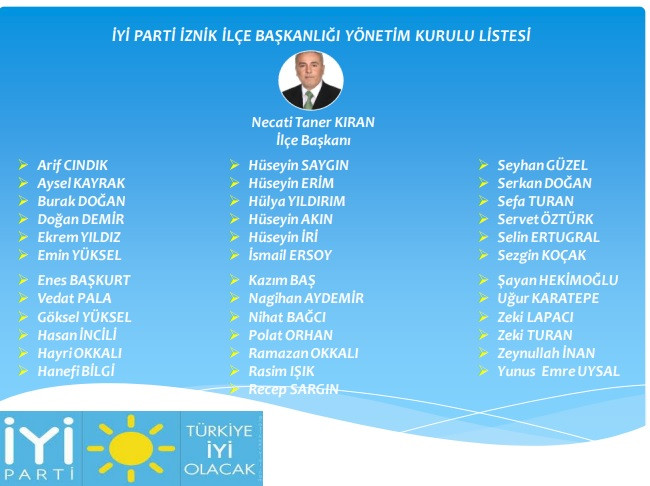 İYİ PARTİ İZNİK İLÇE BAŞKANLIĞI YÖNETİM KURULU LİSTESİ